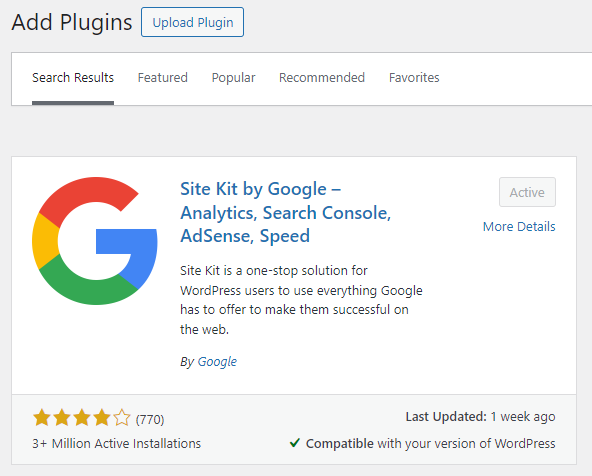•  Enter ‘Google site kit ’ in search bar, you will find search kit plugin in result