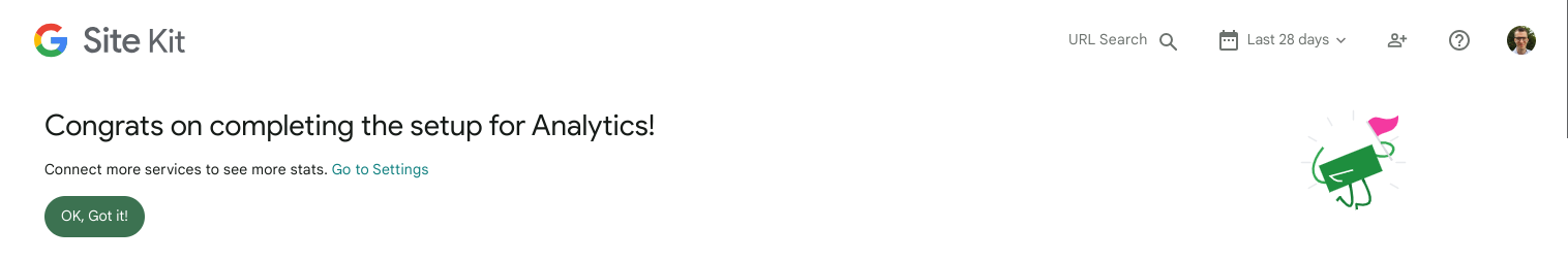 Once you completed Analytics setup process,  you will be redirected to the Site Kit dashboard.